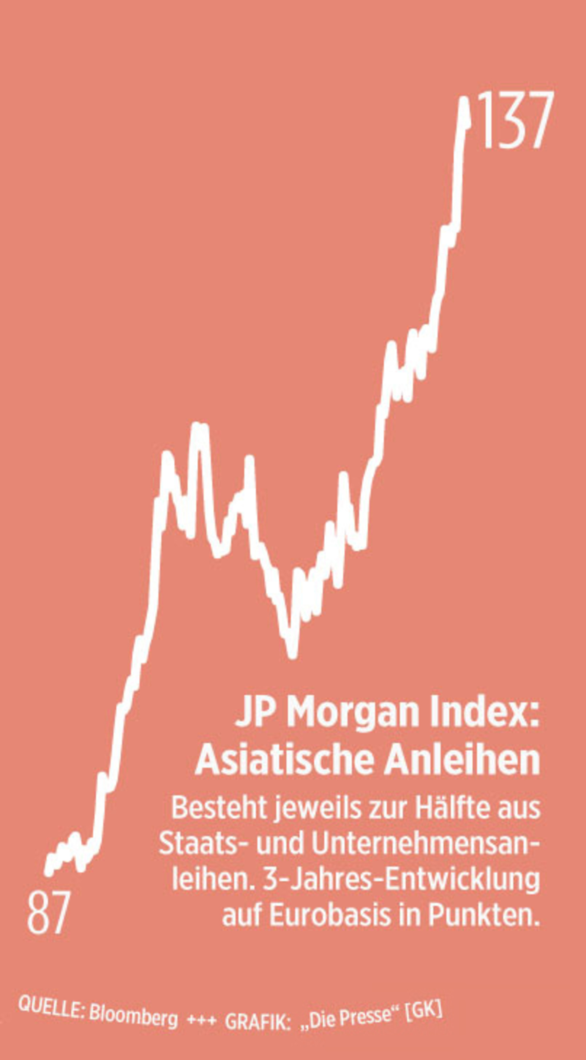 Was die Anleger suchen, ist klar: Rendite. Während sich die Eurozone immer mehr in Staaten teilt, die entweder hohes Risiko bergen oder zu wenig zahlen, um die Inflation zu schlagen, gibt es in Fernost teilweise noch ansehnliche Zinsen. Die Exportnation Südkorea zahlt auf zehnjährige Staatsanleihen 3,1 Prozent (in lokaler Währung). Hier hat aber schon eine kleine Rallye eingesetzt: Vor wenigen Monaten zahlte das Land noch vier Prozent. Südkorea wird von Standard & Poor's mit „A“, also ziemlich solide eingestuft.