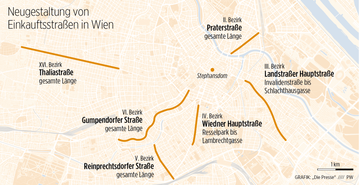 So oder so ähnlich wird vielerorts umgestaltet, Projekte laufen für den Umbau der Bernardgasse (7. Bezirk), Pfleilgasse (8.) und Argentinierstraße (4.). Besonders im Fokus stehen aber die Boulevards der zweiten Reihe, die hinter Kärntner oder Mariahilfer Straße, hinter Shoppingcentern und Onlinehandel ins Hintertreffen geraten sind. In denen Geschäfte zusperren, Imbisse aufmachen. Und die vielfach etwas heruntergekommen sind.