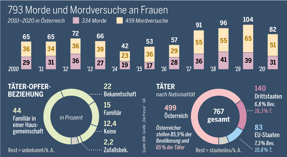 In Wien werden überdurchschnittlich viele Morde und Mordversuche an Frauen verübt. Die Bundeshauptstadt beheimatet rund ein Fünftel (21 Prozent) der österreichischen Bevölkerung, verzeichnet aber mehr als ein Drittel (33,8 Prozent) der Anzeigen wegen Mordes oder versuchten Mordes an Frauen oder Mädchen.