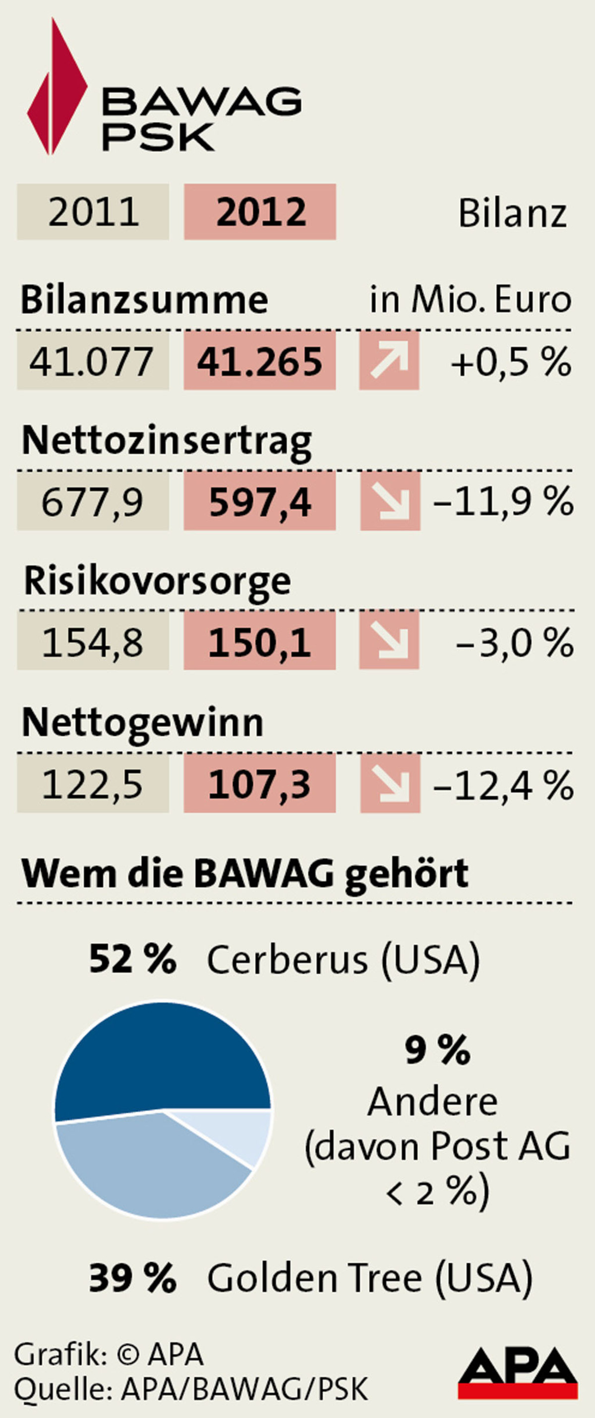 Für das Geschäftsjahr 2012 weist die Bawag einen Nettogewinn von 107,3 Millionen Euro aus. Im Jahr davor waren es 122,5 Millionen Euro gewesen. Das ist ein Rückgang um 12,4 Prozent. Die Bank schließt heuer ein mehrjähriges Kostensparprogramm ab. Filialen will der Vorstand nicht schließen, wurde heute betont. Im Filialnetz teilt sich die Bank größtenteils die Kosten mit der Post.
