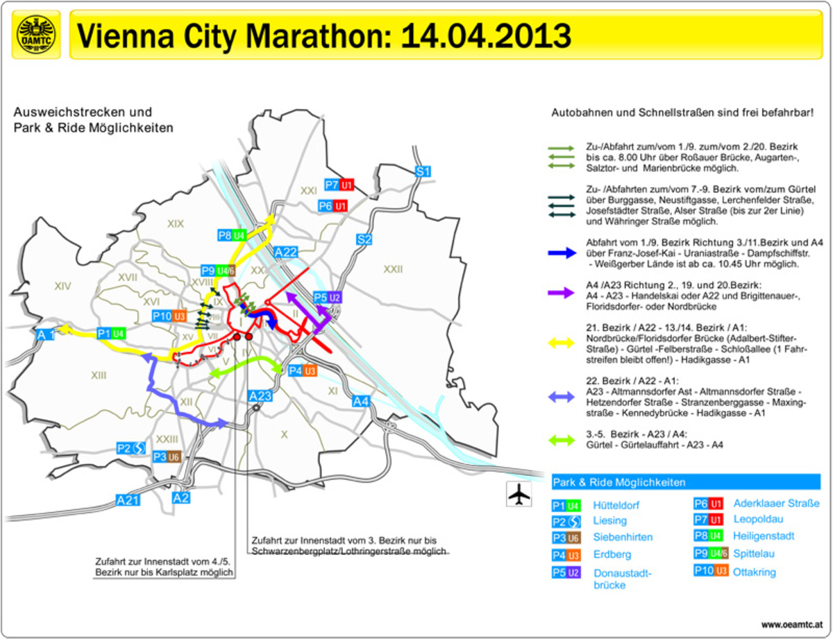 Die Westeinfahrt ist frei, daher ist die Zufahrt zum Flughafen von Westen kommend über Hietzinger Kai, Schönbrunner Straße, Grüner Berg und Altmannsdorfer Straße zur Tangente und Ost Autobahn (A4) problemlos möglich. Von Süden kommend kann man über die S1 fahren. Von den Bezirken 16, 17, 18, 19, 21, und 22 geht es über die Nord- bzw. Floridsdorfer Brücke - A22 - A23. Innerstädtisch empfiehlt der ÖAMTC den Handelskai als Ausweichstrecke.