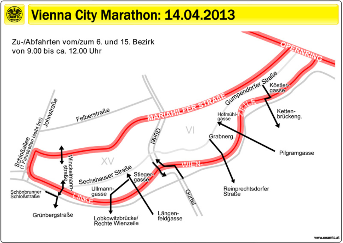 Die Ringstraße kann u. a. in den Bereichen Johannesgasse, Schwarzenbergplatz, Kärntner Straße und Schottengasse gequert werden; die Linke Wienzeile über Pilgrambrücke, Reinprechtsdorfer Straße, Gürtel und Ullmannstraße; die Obere Donaustraße zeitweise über die Donaukanalbrücken. Verzögerungen müssen aber eingeplant werden.