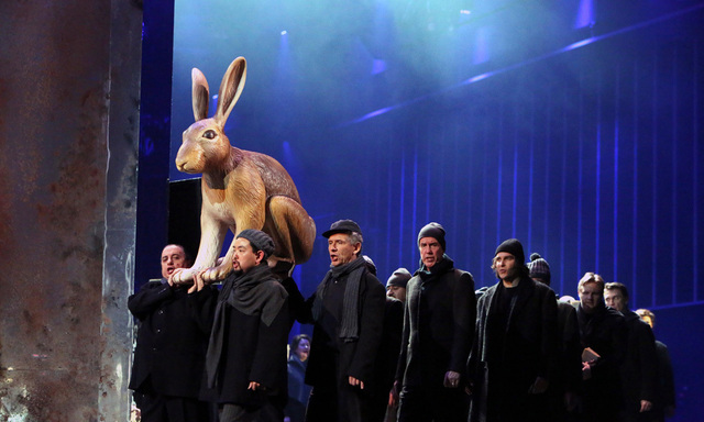 Spieluhrmusik. Regisseur David Pountney und Choreograf Amir Hosseinpour inszenierten darauf ein gewaltiges Lazarettballett, das die Komik der tanzenden Krankenschwestern noch bestürzender macht. Doch Glass' Musik bleibt angenehm, die kleine Idylle im Argen; die Rezitative der Schuldigen und Zitternden, Irrenden und Gnädigen klingen alle gleichermaßen gefasst. Vielleicht wäre es besser gewesen, die Spieluhrmusik laufen zu lassen und darüber rhythmische Prosa zu sprechen? Am stimmigsten war die Vertonung der Szene, in denen ein ländliches Idyll beschworen wird. Mit Alphörnern.