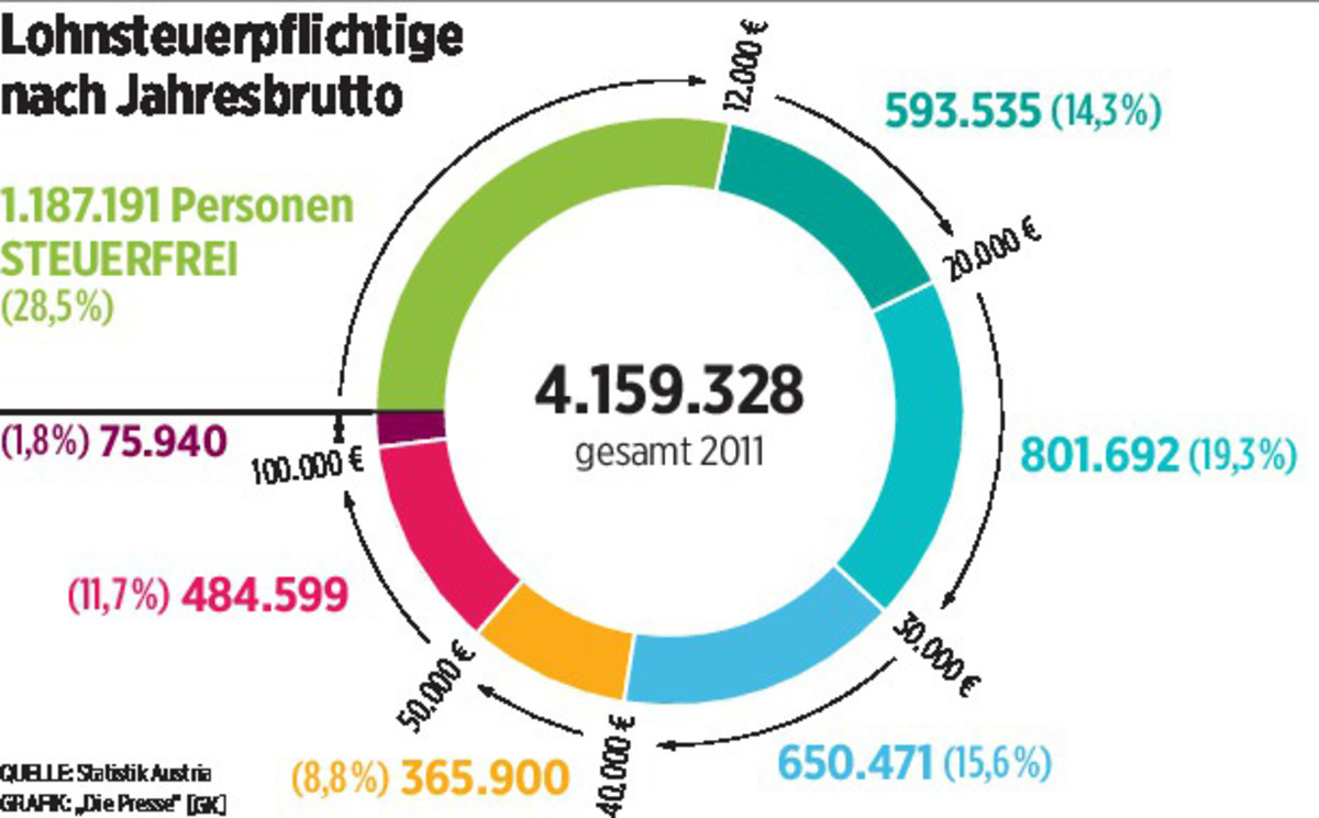 Mit den Einnahmen von drei Milliarden Euro sollen „Einkommen bis 4000 Euro brutto pro Monat“ entlastet werden. Was das im Einzelfall konkret bringt, konnte die SPÖ nicht sagen. Die Statistik Austria erhob für die „Presse“, dass Personen bis zu einem Jahreseinkommen von 56.000 Euro brutto aktuell 12,9 Milliarden Euro Lohnsteuer bezahlen (56,7Prozent vom gesamten Lohnsteueraufkommen). Die SPÖ-Versprechen wären also eine spürbare Entlastung.