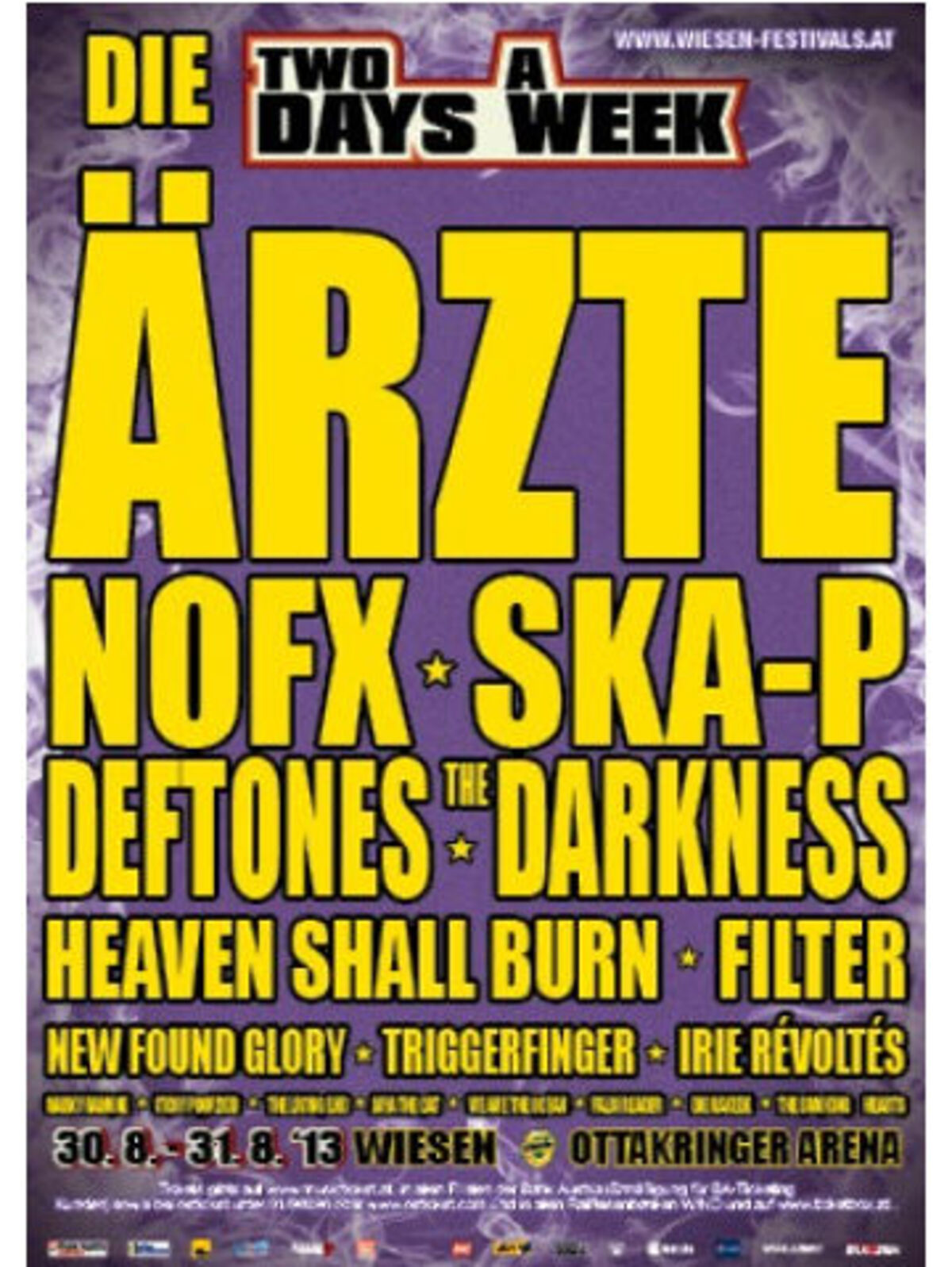 DiePresse.com verlost Tickets für das Two Days a Week Festival von 30.-31. August 2013 in Wiesen. Mit dabei sind Die Ärzte, NOFX, SKA-P, Deftones, The Darkness, Heaven Shall Burn,...