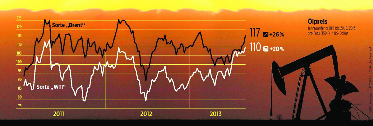 Wien. Um mehr als sieben Prozent sprang der Preis der europäischen Referenz-Ölsorte Brent seit Dienstagfrüh nach oben – auf knapp 120 Dollar je Fass (159 Liter) –, seit klar wurde, dass ein Militärschlag einer westlichen Allianz gegen Syrien nur mehr eine Frage der Zeit ist. Die US-Sorte WTI legte zwar etwas geringer zu, befindet sich aufgrund eines schon länger andauernden Anstiegs jedoch auf dem höchsten Stand seit Mai 2011 (siehe Grafik).
