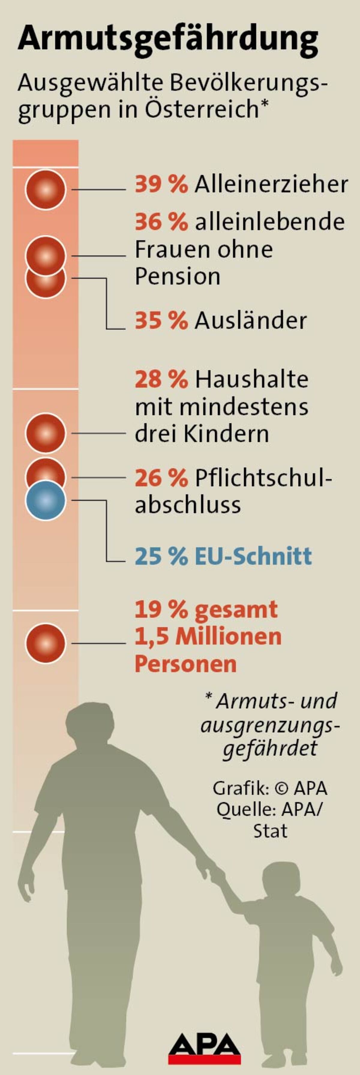 Besonders betroffen sind laut der Erhebung Personen in Ein-Eltern-Haushalten (39 Prozent armuts- oder ausgrenzungsgefährdet). Ebenso tragen auch allein lebende Frauen ohne Pensionsbezug ein erhöhtes Risiko, sowie Personen ohne österreichische Staatsbürgerschaft (je ein Drittel).