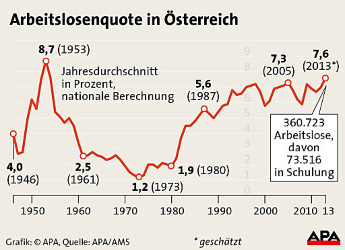 Im Jahr 2013 wurde in Österreich beinahe ein trauriger Rekordwert erreicht. Die durchschnittlichen Arbeitslosenquote von 7,6 Prozent ist die zweithöchste in der Geschichte der Zweiten Republik. Nur im Jahr 1953 war die Quote mit 8,7 Prozent noch deutlich höher, teilte das AMS auf APA-Anfrage mit. In absoluten Zahlen waren seit 1945 noch nie so viele Personen ohne Job, die Beschäftigtenanzahl liegt aber auch auf einem Rekordhoch. Die Arbeitslosenquote war aber um 10,2 Prozent höher als noch im Jahr 2012. Damals lag sie bei sieben Prozent.