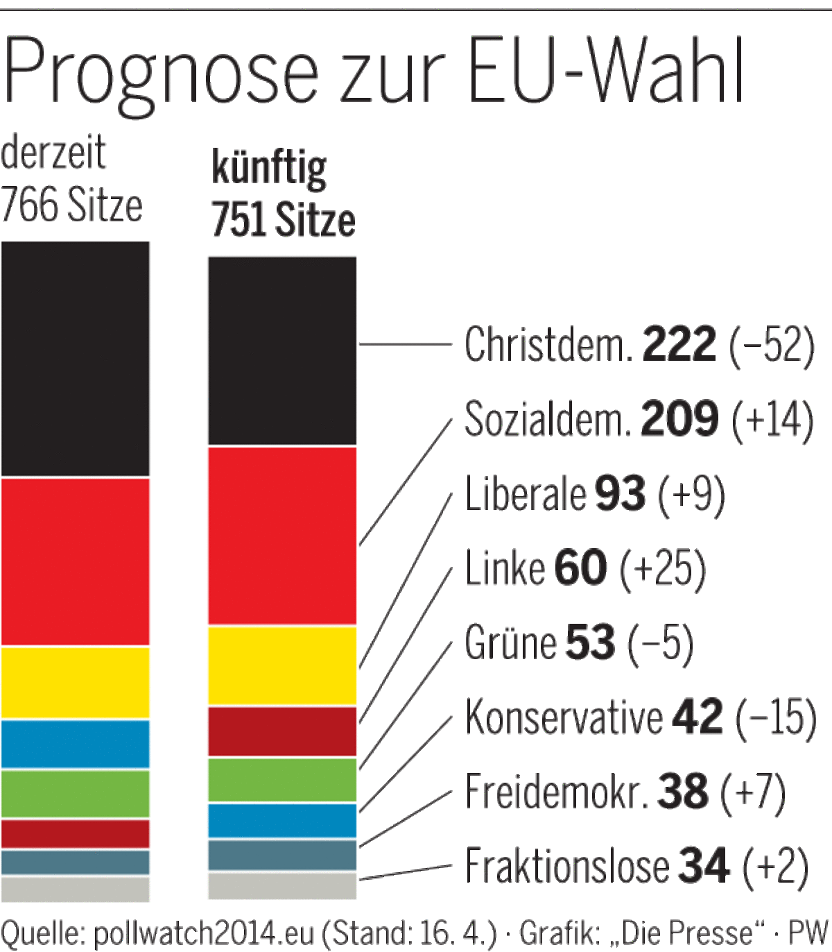 Obwohl der EVP damit das Recht zustehen würde, den nächsten Kommissionschef zu nominieren, wäre ein solches Ergebnis ein Verlust. Sie verfügt derzeit noch über 275Sitze im Europaparlament. Die Sozialdemokraten würden gegenüber dem bisherigen Stand (199Sitze) leicht zulegen. Wobei im Europaparlament insgesamt weniger Mandate zu vergeben sind. Bisher waren es 766, künftig nur noch 751.