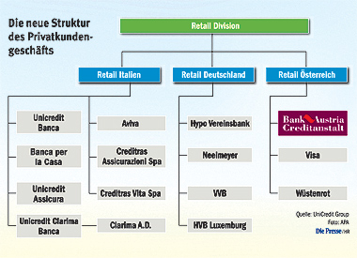 •Das „Retail“-Geschäft, also jenes mit privaten Kunden und Kleinbetrieben bis drei Mio. Euro Jahresumsatz, wird für die Märkte Italien, Deutschland und Österreich von Mailand aus gesteuert. Die in den jeweiligen Ländern tätigen Filialbanken der Gruppe – UniCredit, HVB und BA-CA – seien die „Haupt-Vertriebsnetzwerke“ für die Mailänder Division. Für das Detailgeschäft in Österreich sei freilich auch die unter der Konzernsparte angesiedelte österreichische Retail-Division zuständig.
