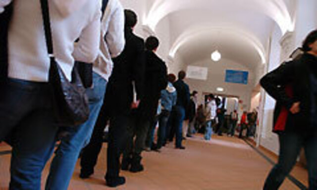 Wer hier steht, der sucht Beratung für die Fächer Soziologie, Politikwissenschaft, Publizistik oder Psychologie. Wobei es vor allem die letzten beiden Fächer sind, für die sich die Wartenden interessieren. „Ich mache das seit Jahren – aber das habe ich noch nie erlebt“, sagt Publizistik-Berater Paul Diernberger über den Ansturm. Mehr als 1400 Personen wollen in Wien Publizistik studieren, doch es gibt nur 962 Plätze. Daher findet heuer erstmals ein Auswahlverfahren statt. In der Psychologie kommen auf 600 Plätze 1500 Interessenten. Hier gibt es aber schon seit zwei Jahren eine Auslese.