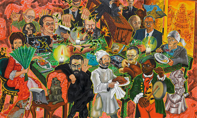 So recht wagt man seinen Augen nicht zu trauen, auch nachdem man die ironischen Pirouetten ausgemacht hat, die diesen ultimativen Kniefall des Künstlers vor seinem Sammler so galant begleiten. Auch über zehn Jahre nach seinem Entstehen kann man schwer fassen, was man in diesem Monumentalgemälde, das angeblich den Salon zeigt, in dem „Österreich ist“, serviert bekommt. So wie den penetrant duftenden Braten, den ein zum schlitzohrigen Maître degradierter, ehemaliger Wiener Museumsdirektor dieser schrägen Tafelrunde auftischt.