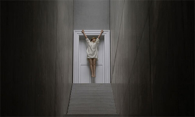 Doch der Fluchtweg ist versperrt. Noch nie war ein schmaler, düsterer Stiegenaufgang in Zumthors Kunsthaus so schmal und düster wie hier. Noch nie die 39 Stufen so steil, so schleppend zu bewältigen. Denn am Ende wartet es, das Trauma, eine junge Frau, wie schlafwandlerisch rückhands an einem bürgerlichen Türrahmen hängend, ihr Kopf christusgleich auf die linke Schulter gesunken, die nackten, aus dem Nachthemd gestreckten Beine kulminieren in leicht hysterisch überspannten Füßen. Wer spätestens bei diesem traumatischen Horror-Snapshot nicht zu heulen beginnt, ist kein Italiener. Die anderen überlegen sich eben, was im Saal dahinter liegen mag, im obersten Stock, dessen Betreten die schöne Scheintote versperrt: der Himmel? Unser Unbewusstes? Der Dachboden? Oder all das zusammen?