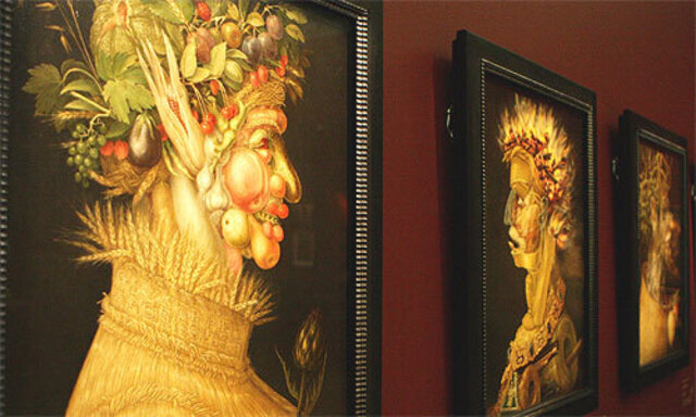 Am ehesten, so Ferino, war es Arcimboldos Ruf als Gestalter opulenter Festzüge. War etwa derart ephemere Produktion – das Entwerfen von Rüstungen, Prunkwägen, Kostümen, Balldekorationen – die eigentliche Hauptaufgabe des Malers? Das würde auch erklären, warum sein überliefertes Werk so überschaubar blieb. Auch von diesen Entwurfszeichnungen wurden einige für die Ausstellung aufbereitet. Im Zentrum aber können natürlich nur seine prächtigen Komposit-Köpfe stehen. Neben den Karikaturen des Hofpersonals, eines sichtlich gefräßigen Juristen etwa, ist ein eigener Saal den mindestens fünf Mal kopierten und stolz quer durch Europa verschickten Jahreszeiten- und Elemente-Serien gewidmet.