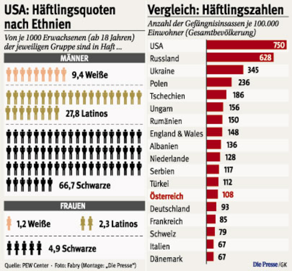 2.319.258 Menschen, die älter als 18 Jahre sind, sitzen mit Stand Anfang 2008 in US-Gefängnissen. Im weitaus bevölkerungsreicheren China, das laut der Statistik bei der Zahl der Häftlinge weltweit an zweiter Stelle liegt, sind es 1,5 Millionen Menschen. Russland, abgeschlagener Dritter, hat eine Häftlingszahl von 890.000.