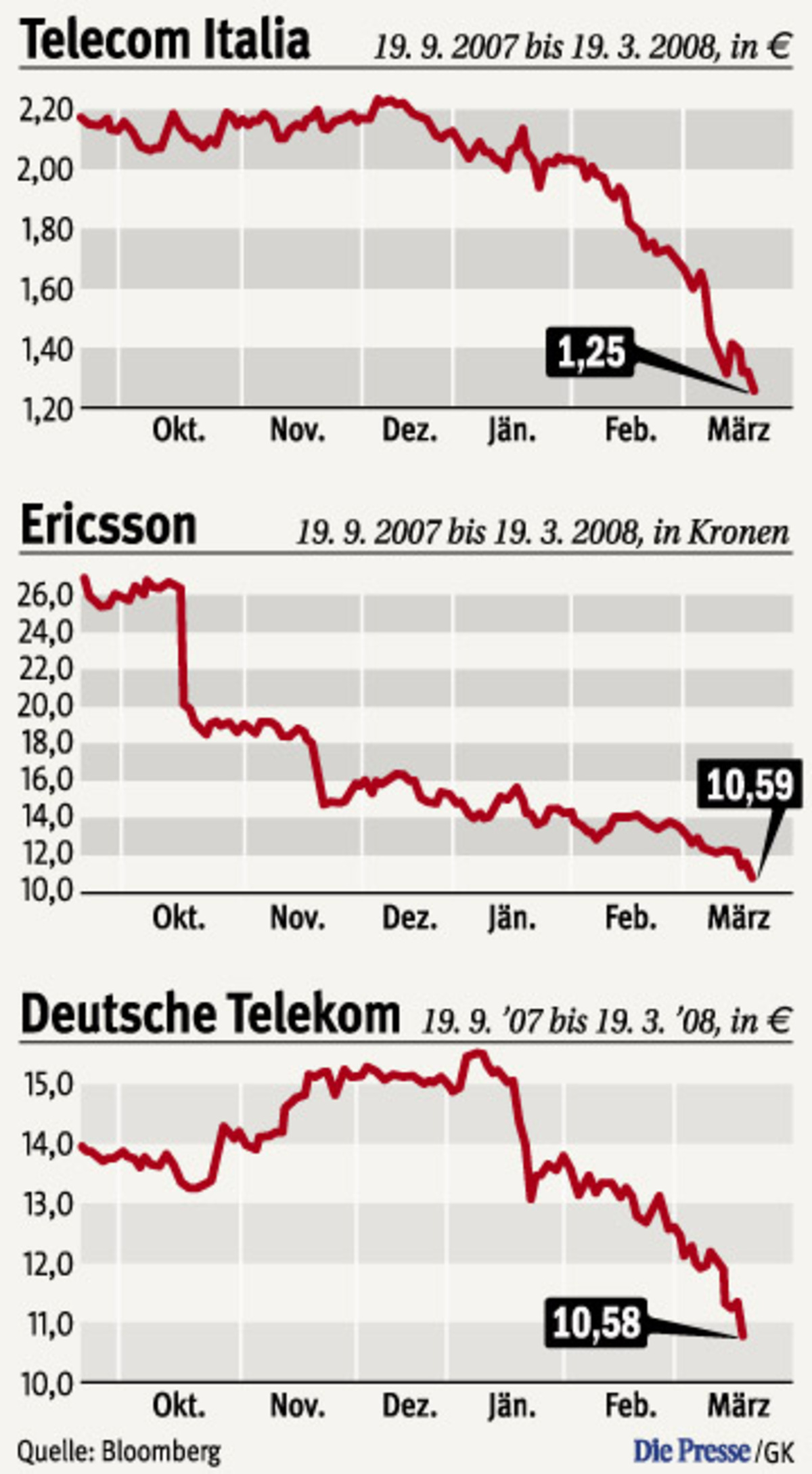 Bonn/ Stockholm/ Mailand (ag.). Anleger, die bisher gehofft haben, dass sie mit Telekom-Werten von den Turbulenzen auf den Finanzmärkten einigermaßen ungeschoren davon kommen würden, erlebten am Mittwoch einen gehörigen Schock. Die Wurzel des Übels war einmal mehr die durch die US-Subprimekrise ausgelöste allgemeine Rezessionsangst, die auch das Geschäft der Telekomanbieter bremst.