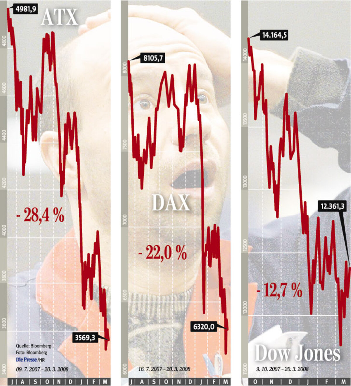 2 Ist das Schlimmste überstanden, oder dauert die Krise noch?Kern der Krise ist ein ungeheurer Vertrauensverlust im Bankensystem. Derzeit weiß noch niemand, welche Subprime-Leichen noch in welchen Bank-Kellern liegen – und die betroffenen Institute mauern nach wie vor, wo es geht. Solange das nicht geklärt ist, wird sich die Krise verschlimmern. Internationale Beobachter gehen jedenfalls davon aus, dass es zumindest in den kommenden Monaten noch einige böse Überraschungen geben wird. Nur Optimisten glauben, dass es ab dem Herbst wieder aufwärts gehen könnte.