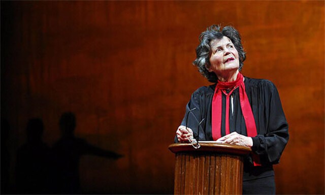 Als der schwarze Vorhang des Akademietheaters hochgeht, kommt ein imposantes Bühnenbild von Erich Wonder zum Vorschein: Ein riesiger safranfarbener Block, der im Verlauf des Abends wie von innen zu leuchten beginnt. Links hinten sind drei Schatten aufs Bild gezeichnet, die erste Figur zeigt nach rechts. Von dort tritt Annemarie Düringer auf, im Trenchcoat, mit Hut. Sie geht an die Rampe, legt beides auf eine Reihe mit Theatersesseln, stellt sich an ein Pult und beginnt Henry Millers seltsame Erzählung „Das Lächeln am Fuße der Leiter“ vorzutragen, 70 Minuten lang. Damit haben Miller und seine Interpretin (Leitung: Klaus Pohl) das Publikum am Samstagabend bezaubert.
