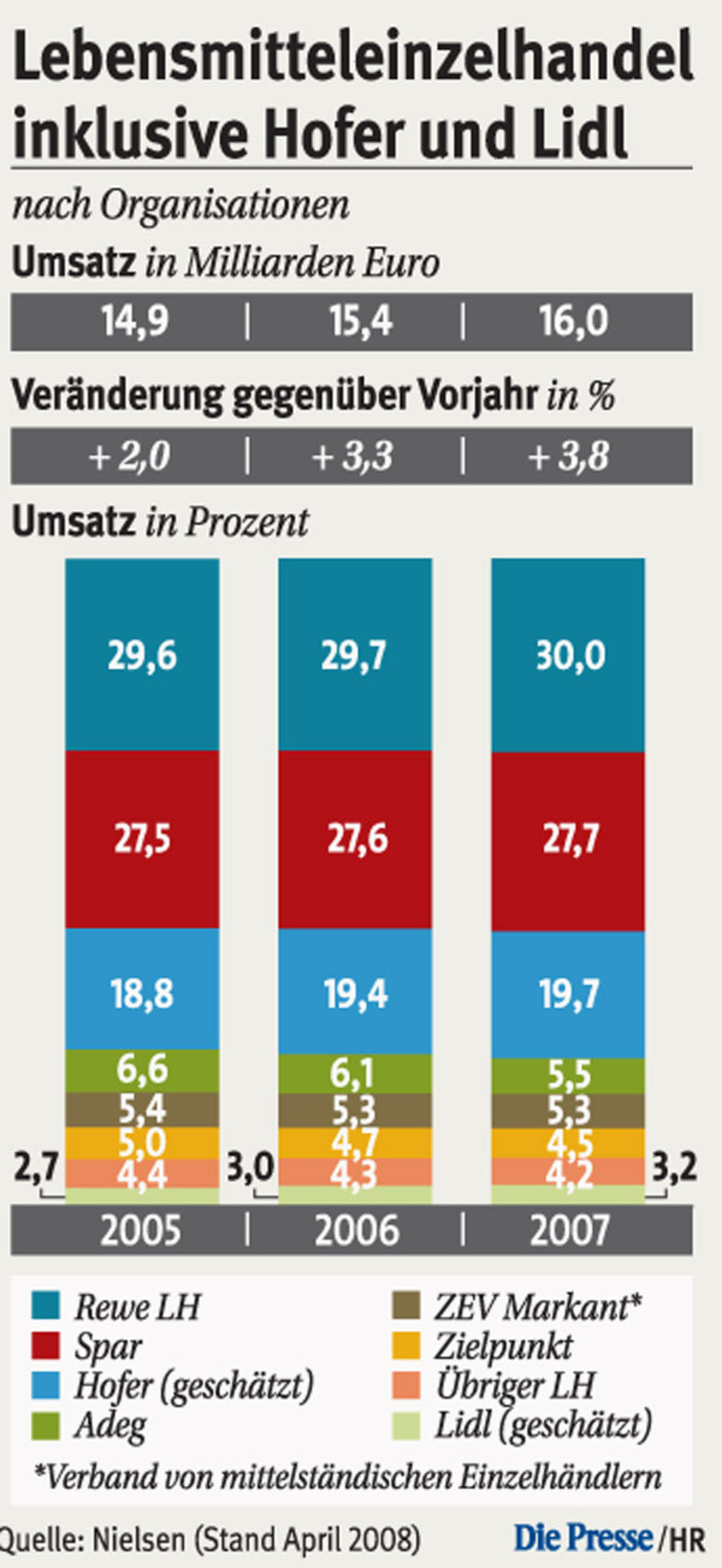 16 Mrd. Euro wurden 2007 bei Billa, Spar & Co. ausgegeben. Das sind 3,8 Prozent (inflationsbereinigt 1,5 Prozent) mehr als im Jahr zuvor. Die Marktanteile der drei größten Ketten, Rewe, Spar und Hofer, wachsen weiter. 2007 haben die Top drei 77,4 Prozent des Marktes beherrscht.