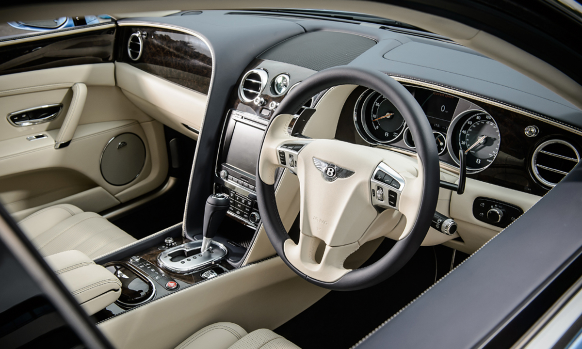 25 Stunden braucht es, um den Innenraum, in dem nicht weniger als 14 komplette Kuhhäute zu feinstem Leder verarbeitet sind, mit kontrastierenden Nähten auszustatten. Zehn Quadratmeter Holzfurnier wandern in jeden Flying Spur; die Tischler brauchen