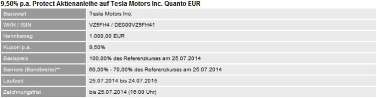 Aktuell in Zeichnung: Protect Aktienanleihe auf Tesla...