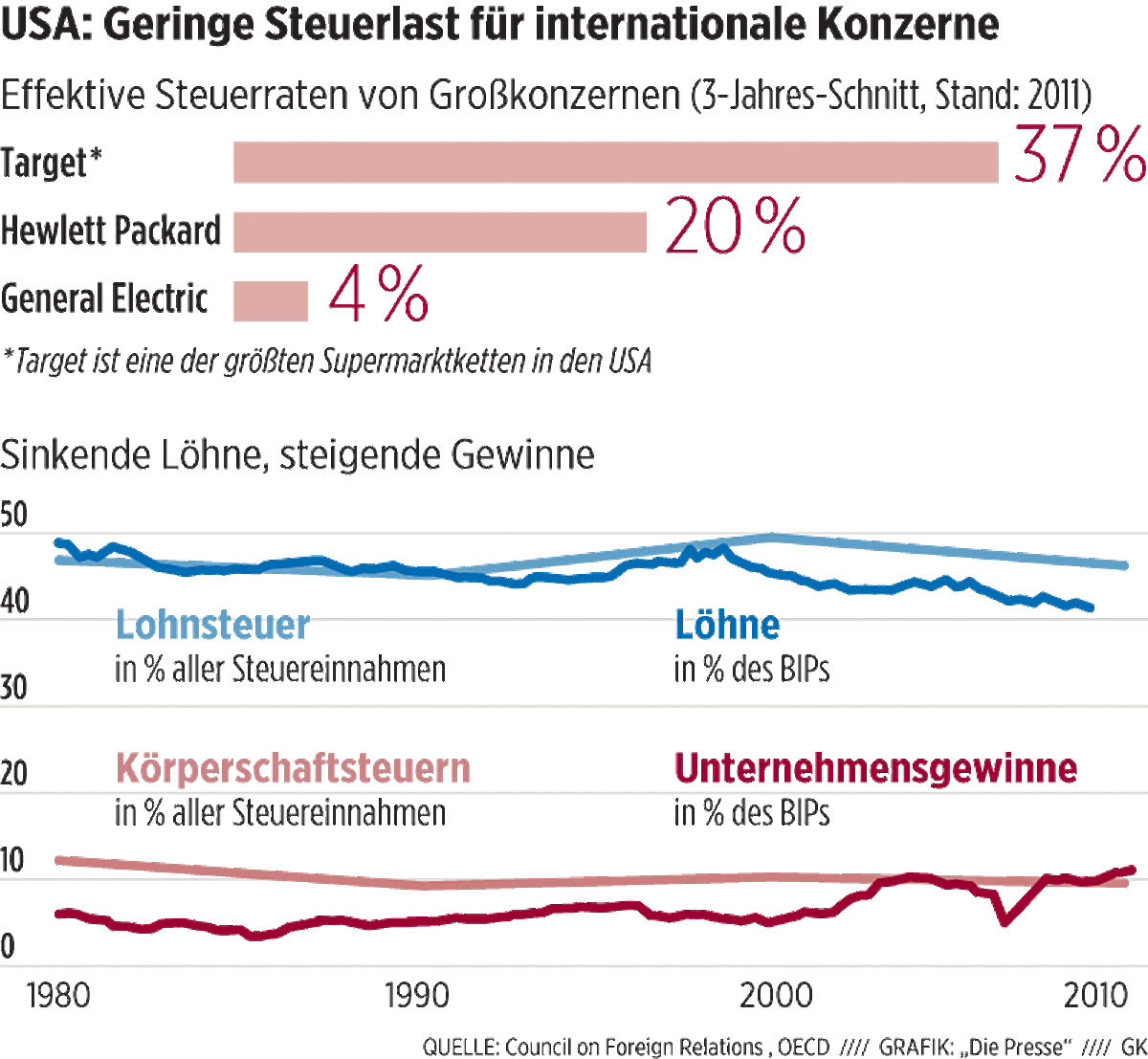 Das klingt schlüssig. Es ist aber nicht wahr. Amerikas globalisierte Konzerne zahlen durchschnittlich nur die Hälfte des nominellen Steuersatzes– und diese umfasst auch die zusätzlichen Abgaben an die jeweiligen Bundesstaaten. Im Jahr 2010 betrug ihre echte Konzernsteuerlast 13 Prozent: wohl kaum eine Bürde, die jegliche Wettbewerbsfähigkeit erstickt. Möglich wird das dadurch, dass sie ihre im Ausland erzielten Gewinne so lang nicht versteuern müssen, wie sie nicht zurück ins Land transferiert und zum Beispiel als Dividenden an ihre Aktionäre ausgeschüttet werden.