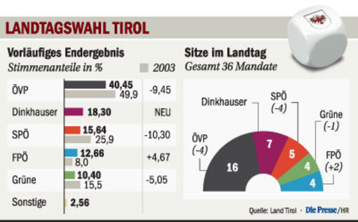 In der ÖVP gibt man sich gelassener: Vizekanzler und ÖVP-Obmann Wilhelm Molterer hingegen hat das Abschneiden der Volkspartei bei den Tiroler Landtagswahlen als "respektables Ergebnis" bezeichnet. Die Tiroler Volkspartei habe "hart gekämpft und konnte die Wähler in Tirol mobilisieren", meinte der Finanzminister. Das Antreten des ehemaligen Tiroler AK-Präsident Fritz Dinkhauser mit einer eigenen Liste habe "die Tiroler verunsichert und die ÖVP belastet", suchte er Ursachen für die starken Verluste seiner Partei. Für Molterer habe die ÖVP aber "trotz der Abspaltung Dinkhausers" ihren "Führungsanspruch in Tirol" erfolgreich verteidigen können.