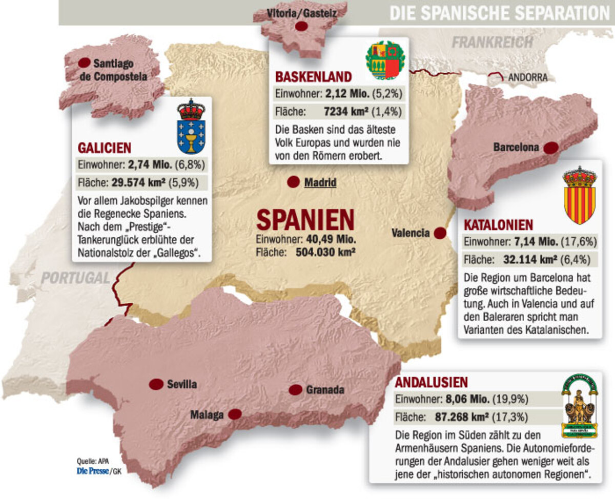 Denn seit den späten Siebzigern, den Jahren der „Transition“ von der Diktatur zur Demokratie, akzeptierten die Spanier das seltsame Modell eines „asymetrischen Föderalismus“. Das Motto hieß: Kaffee für alle, Champagner für die historischen Nationen mit eigenen Sprachen – also das Baskenland, Katalonien und Galicien. „Zapatero aber gab den Nationalisten mehr, als sie gefordert hatten. Damit geriet das System außer Kontrolle“, klagt Andrés Ollero, Ex-PP-Abgeordneter und Leiter eines Think Tanks in Madrid. Die Begehrlichkeiten begannen zu wuchern. Als erstes brachen Andalusien mit der Kaffee-Champagner-Formel. Dort spricht man zwar Spanisch, aber immerhin waren Granada und Sevilla zu Kolumbus' Zeiten das Zentrum der Welt.