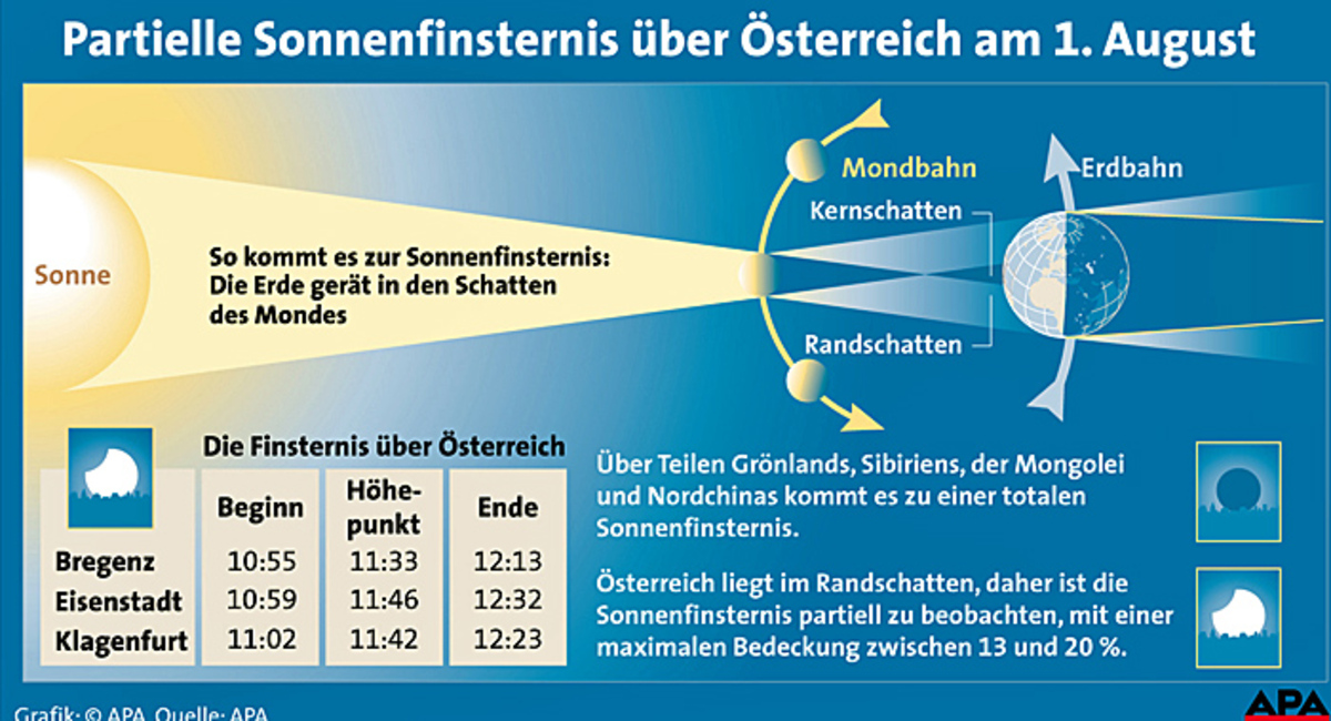 Um 10.55 Uhr hat sich der Mond in Bregenz vor die Sonne geschoben, in Eisenstadt war die Sonnenfinsternis vier Minuten später zu sehen. In Eisenstadt war die Finsternis mit 19 Prozent Sonnenverdeckungr am besten zu sehen.