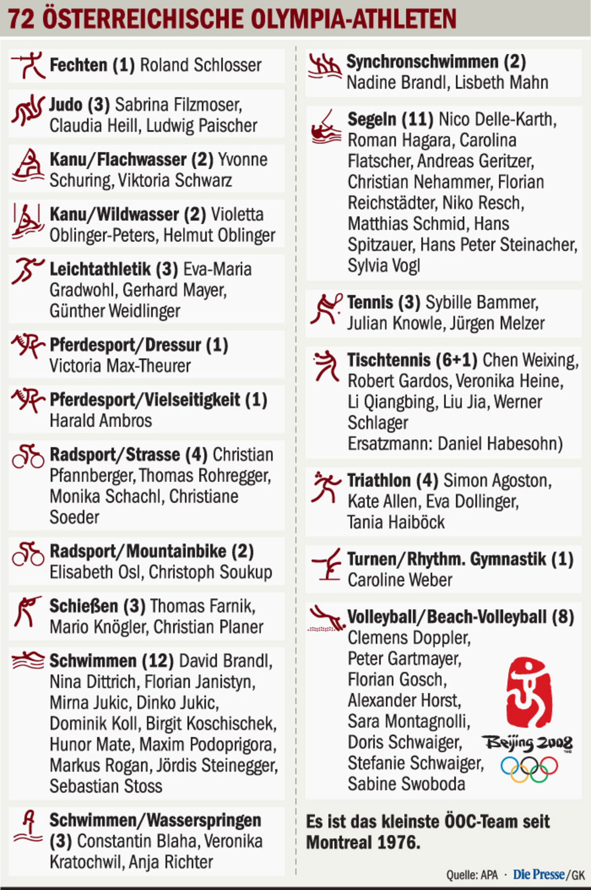 „Ich hoffe auf die eine oder andere Medaille und freue mich über jede. Zahl werden Sie von mir keine hören“, sagt Wallner nach der einer Zeremonie gleichenden Verlesung aller Namen. Und so klein die Mannschaft auch auf den ersten Blick für kritische Geister wirken mag, im kleinsten Aufgebot seit Montreal 1976 (64 Aktive) stecken durchaus gleich mehrere Medaillen-Kandidaten. Es sind: Markus Rogan (200 m Rücken), Judoka Sabrina Filzmoser (bis 57 kg), Kate Allen (Triathlon), die Segler Hagara-Steinacher (Tornado), Andreas Geritzer (Laser) oder Silvia Vogl/Carolina Flatscher (470) oder der Schütze Christian Planer.