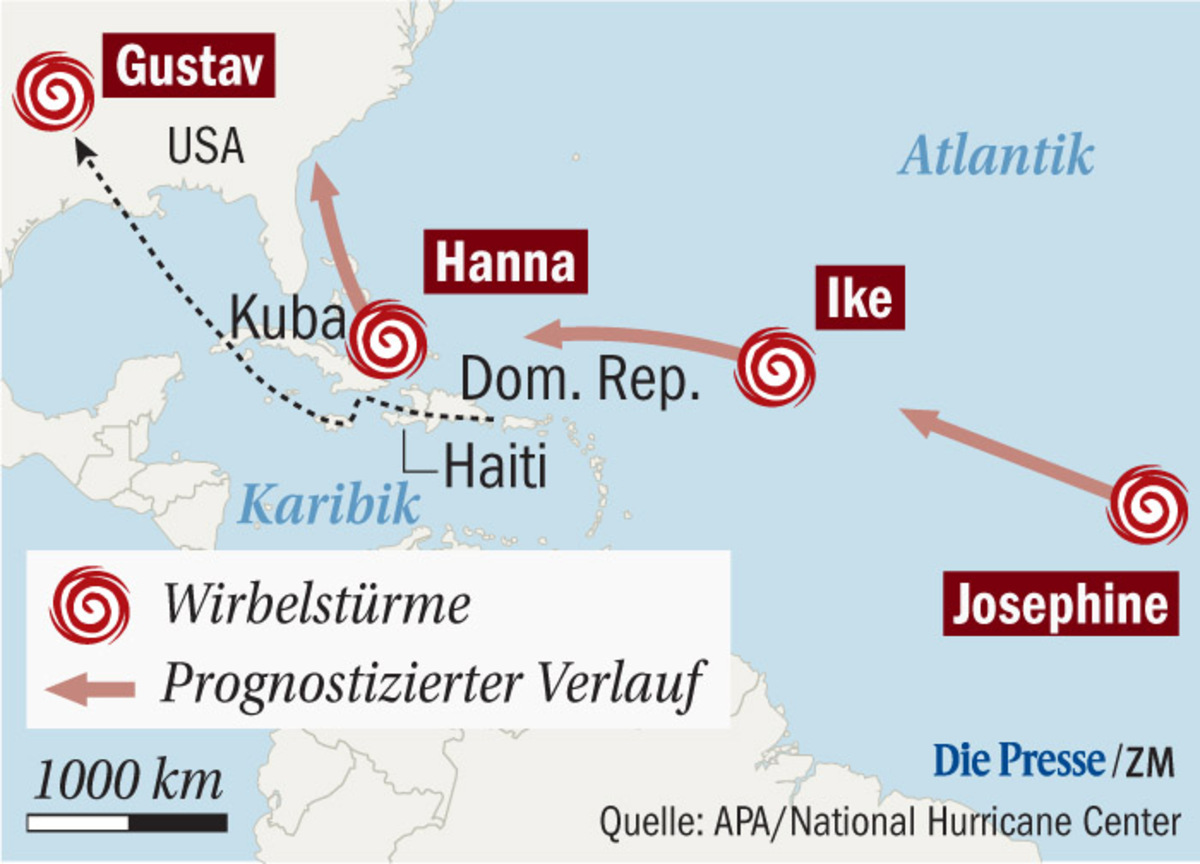 Gustav hat in New Orleans doch nicht so schrecklich gewütet wie befürchtet, lange nicht so arg wie Katrina 2005, er zieht auch längst weiter. „Gustav moving into Southwest Arkansas with heavy rain“, hieß es gestern, Mittwoch, auf der Homepage der „National Oceanic and Atmospheric Administration“ (NOAA, www.nhc.noaa.gov). Seine Nachfolgerin Hanna hat soeben Haiti heimgesucht; Ike und Josephine, noch über dem Atlantik, ziehen unaufhaltsam westwärts . . .