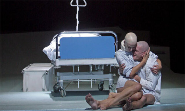 Das Ende sieht man gleich am Anfang, Henrik Ibsens übertriebener Fantast Peer Gynt (Raphael von Bargen) liegt schwer krank im Spital. Sein Gesicht ist gezeichnet, das wirkt unter kaltem Neonlicht besonders gut: kahl geschoren ist er, blaue Flecken hat er. Bedrohlich piepsen die Geräte. Die melancholische Musik (Gerald F. Preinfalk, unterstützt von Maria Gstättner und Clemens Wenger) verheißt auch nichts Gutes. Vor dem Fenster sieht man einen unheimlichen zweiten Krankenhausturm wie den des Wiener AKH. Am Bett sitzt Peers Mutter Aase (Beatrice Frey). Eine grüne Putzfrau (Claudia Sabitzer), die sich als Tochter des Trollkönigs herausstellen wird, entsorgt Müll.