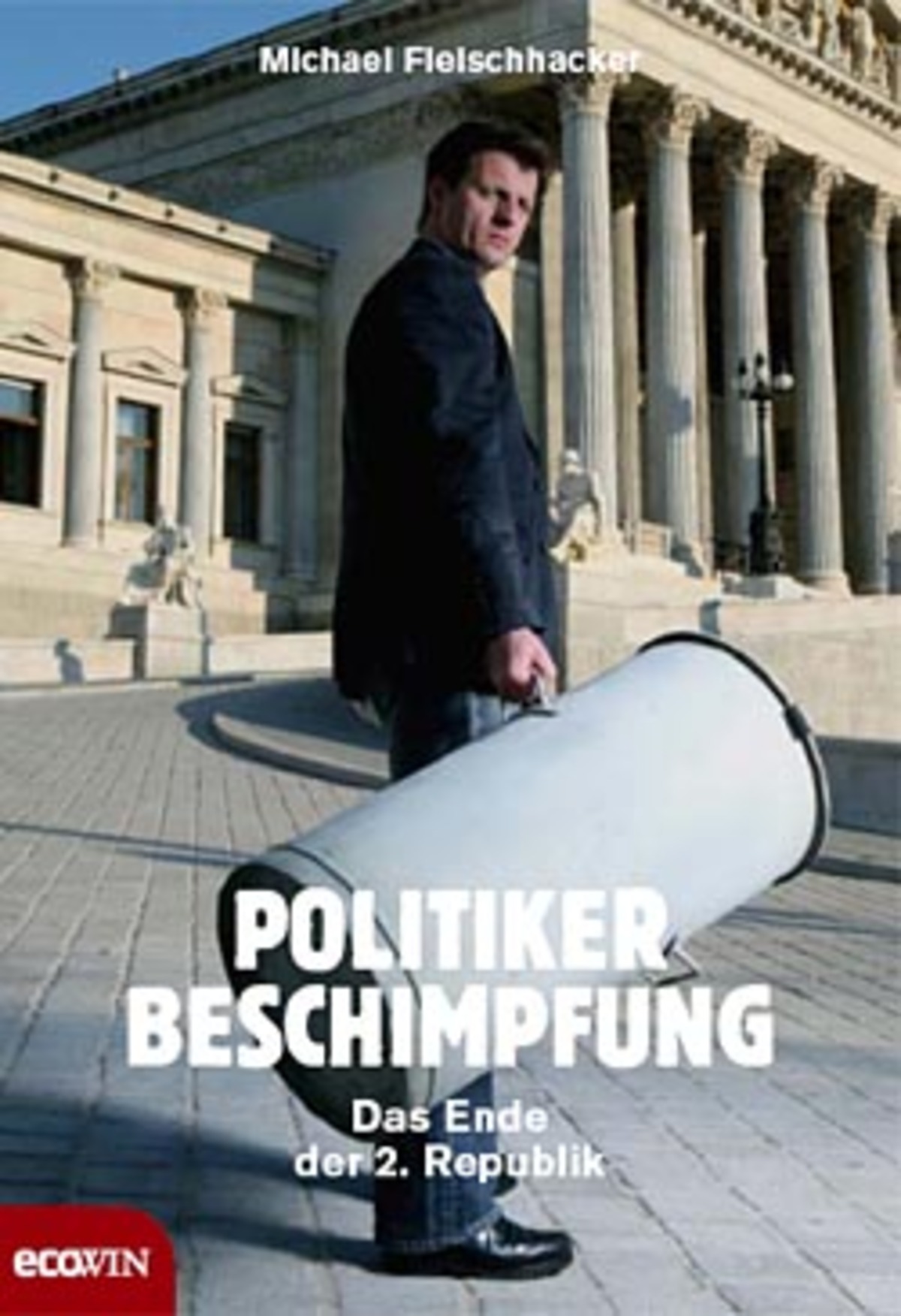 Zum Lachen ist Michael Fleischhackers Buch nicht. Es trägt den Titel „Politikerbeschimpfung“, und wem das nicht grell genug und auch der Untertitel („Das Ende der Zweiten Republik“) zu harmlos ist, der betrachte das Umschlagbild: Einen entschlossen blickenden jungen Mann zeigt es, in Jeans und tadellos geputzten Schuhen, der vor dem Parlament steht und eine – schwer erkennbare – Mülltonne trägt. Was will er wohl mit ihr entsorgen? Die Gesetzesflut, den Koalitionsverdruss, den Postenschacher, den Übermut der Parteien, die Parlamentarierinnen und Parlamentarier, ihr bequemes Verhältniswahlrecht und die willfährige Berichterstattung mancher Medien?