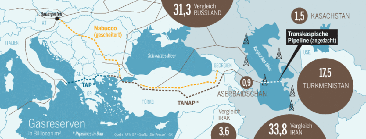 Denkt man dabei mittel- und langfristig, kommt Europa um eine Gegend ganz bestimmt nicht umhin: den Raum rund um das Kaspische Meer. Hier liegen Vorräte, die Europas Herz schon vor Jahren haben höher schlagen lassen. Hier auch haben europäische Konzerne unter der Leitung der OMV jahrelang versucht, über eine sogenannte Nabucco-Pipeline Zugang zu den Ressourcen zu erhalten. Das Unterfangen ist im vorigen Sommer aus diversen Gründen gescheitert. Zumindest die geplante Route nach Wien findet nicht statt. Stattdessen hat ein von der aserbaidschanischen Gasgesellschaft Socar und der britischen BP geführtes Konsortium eine Pipeline namens TAP über Griechenland und das Adriatische Meer bis nach Süditalien beschlossen. Anfänglich zehn und später vielleicht 20 Mrd. Kubikmeter sollten dort ab 2018 fließen – gefördert aus aserbaidschanischen Quellen, vor allem aus dem Feld Schah-Deniz.