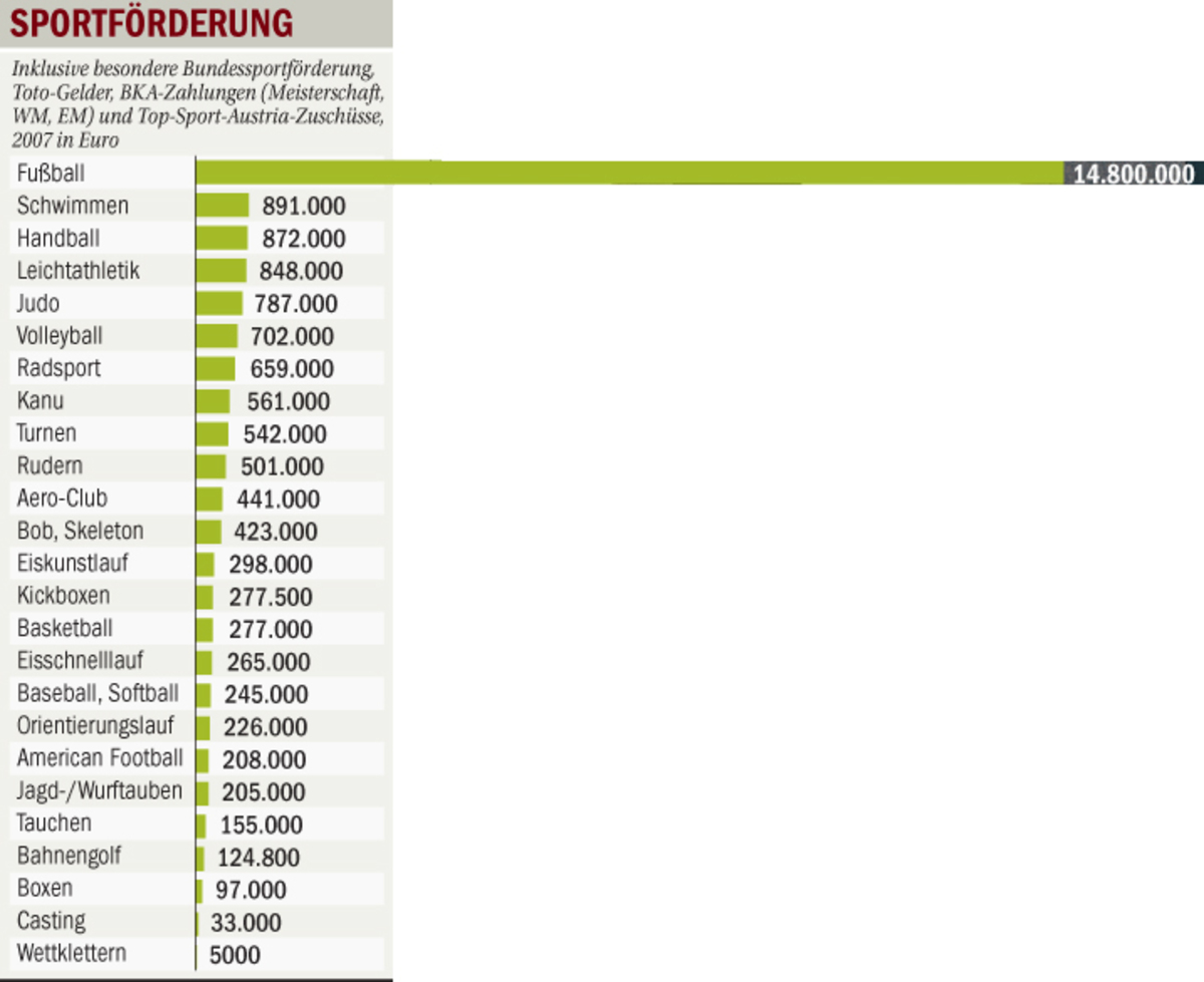 Was die Förderungen betrifft, so ist der Fußball hierzulande absoluter Spitzenreiter, im Jahr 2007 wurden insgesamt 14,8 Millionen Euro in diese Sportart gebuttert. Das Flaggschiff, die Nationalmannschaft, rechtfertigt diese Summe jedenfalls nicht. Auch auf Vereinsebene wartet man vergeblich auf durchschlagende Erfolge, der Großteil des Geldes fließt allerdings in die Breite.