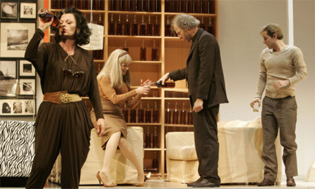 Dann brandet Applaus auf. Denn selbst wenn die Schauspielerin, die zuvor schon mindestens einen Liter von dem braunen Zeug runtergestürzt hat, bloß gefärbtes Wasser konsumiert, ist das eine respektable Leistung. Was für ein Trick, was für ein athletischer Akt! Im Vergleich dazu hat man Elizabeth Taylor und Richard Burton in der Verfilmung des Stückes geradezu als Abstinenzler in Erinnerung.