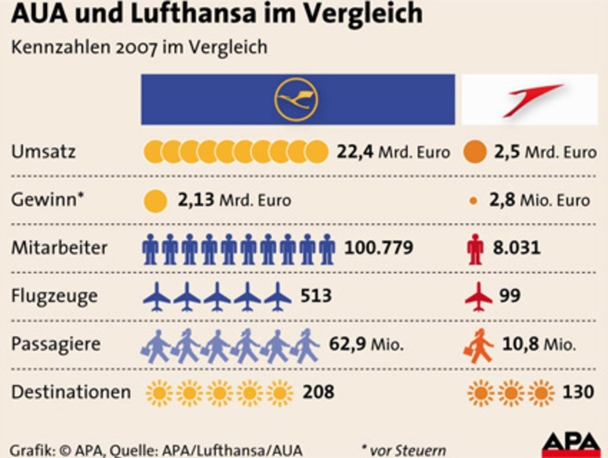 Die Lufthansa galt als langjähriger AUA-Partner in der Star Alliance als Favorit. Nun kauft die deutsche Fluglinie die AUA um eine Milliarde Euro.Die Lufthansa zählt zu den wenigen Airlines, die 2007 Gewinne machten:- Umsatz 2007: 22,4 Mrd. Euro- Mitarbeiter: 100.779