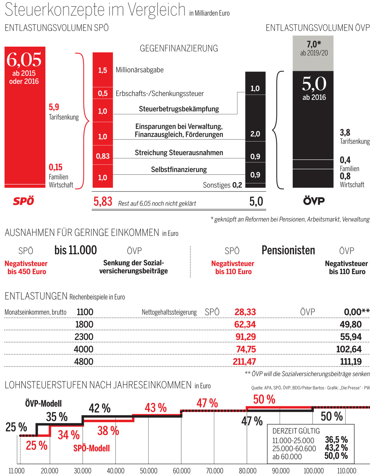 Wien. Beim Geldverteilen werden sich SPÖ und ÖVP recht bald einig sein. Das Steuerreformkonzept, das die ÖVP am Mittwoch präsentiert hat, unterscheidet sich zwar ein wenig von dem schon länger vorliegenden Papier der SPÖ. Während die Sozialdemokraten um 5,9 Milliarden Euro die Steuertarife senken wollen, sieht das ÖVP-Konzept nur 3,8 Mrd. dafür vor (800 Mio. Euro gehen an die Wirtschaft, 400 Mio. an die Familien). Der Eingangssteuersatz sinkt bei beiden auf 25 Prozent, bei der SPÖ gilt er aber für den Einkommensbereich bis 20.000 Euro, bei der ÖVP nur bis 16.000 (Details siehe Grafik).