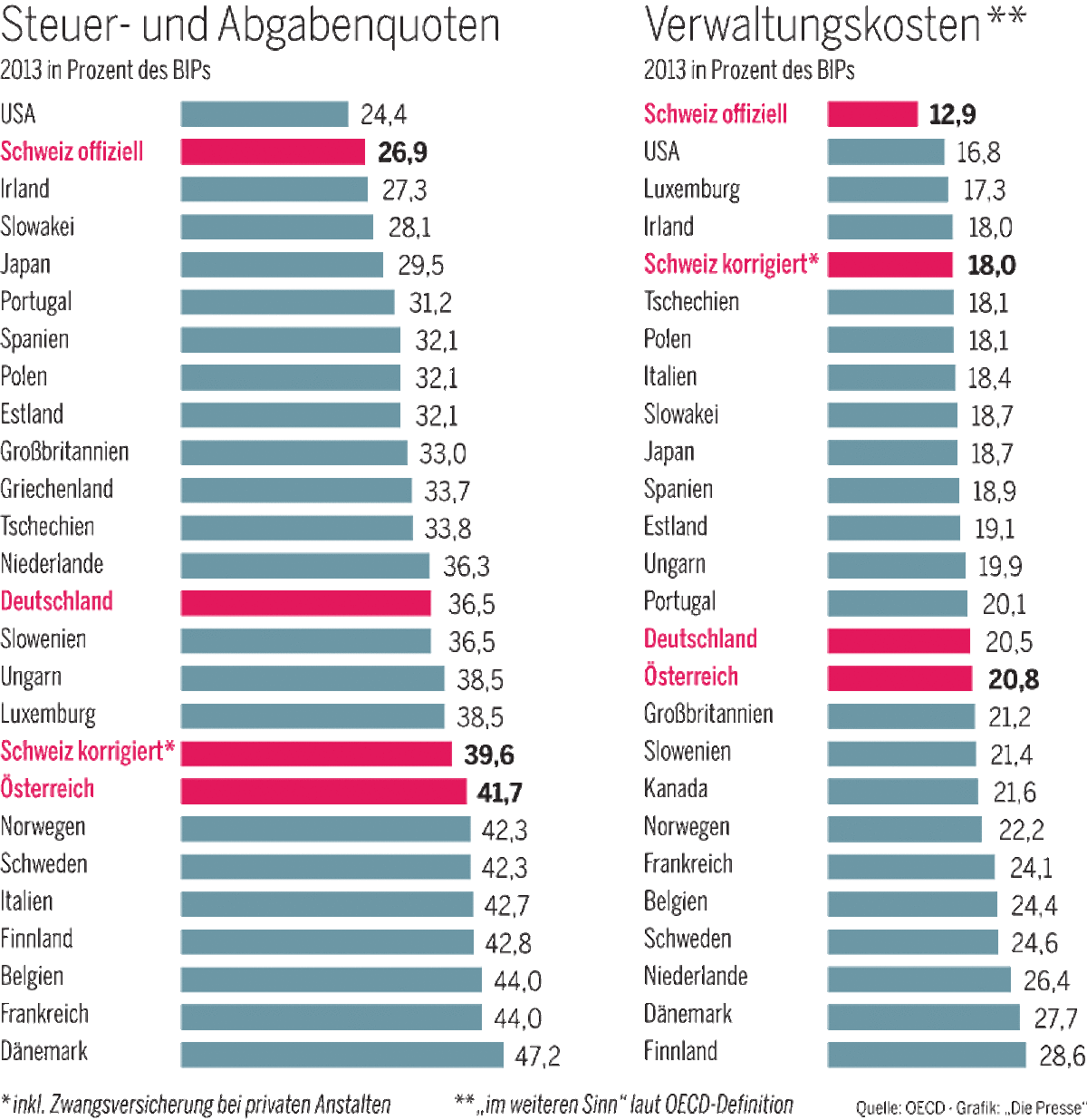 Verzerrte Quote. Sie werden in der Schweiz zum Teil von privaten Anstalten eingehoben, weshalb die volkswirtschaftliche Gesamtrechnung sie dem Privatsektor zurechnet. Da aber jeder Bürger verpflichtet ist, mit fixierten Beträgen für Krankheit und Pension vorzusorgen, gehören diese zum Ländervergleich der Abgabenquoten. Damit steigt der Schweizer Wert auf 39,6 Prozent, was nicht mehr so weit vom österreichischen entfernt ist. Der überraschende Sieger im Drei-Länder-Bewerb ist Deutschland mit 36,5 Prozent. Müssten Österreicher so wenig Steuern wie die Deutschen zahlen, hätten sie von vornherein 17 Milliarden Euro mehr in den eigenen Taschen.