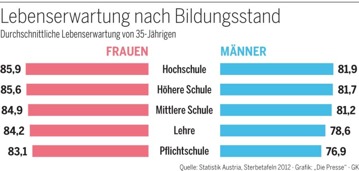 Zum Beispiel die umgekehrte Kausalität: Wer kränklich ist, kann weniger arbeiten und ist dadurch ärmer. Vor allem aber könnte der wahre Grund in etwas liegen, das bei Reichen häufiger vorkommt als bei Armen, aber nicht (nur) am Einkommen hängt – zum Beispiel gute Bildung. Wer mehr weiß, verdient meist mehr. Aber er weiß auch, wie er sein Essen gesünder zubereitet. Nun korreliert auch Bildung klar mit der Lebenserwartung: Wer mehr gelernt hat, lebt länger (siehe in der Grafik die Zahlen zu Österreich). Bildung aber ist in einem Wohlfahrtsstaat – zumindest der Theorie nach – allen zugänglich. Was nun wirklich über ein kurzes oder langes Leben entscheidet, darüber grübeln die Ökonomen seit Langem. Keineswegs eine rein akademische Debatte: Politiker sollten wissen, ob sie Gesundheit und langes Leben eher durch Umverteilung oder bessere Ausbildung fördern können. Doch die Datenlage schien bisher zu schwach für starke Aussagen.