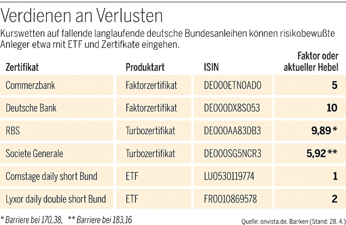 Dazu bieten sich börsengehandelte Passivfonds, sogenannte ETFs, sowie Zertifikate an, mit denen man – auch gehebelt – genauer gesagt auf fallende Kurse des Euro-Bund-Future setzen kann. Dieser wird an der deutschen Terminbörse gehandelt und bildet die erwartete künftige Entwicklung einer synthetischen zehnjährigen deutschen Bundesanleihe (fiktive Anleihe, die aus einer real existierenden Anleihe berechnet wird) mit einem Kupon von sechs Prozent ab.