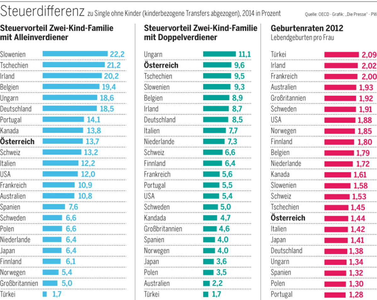 Am Beispiel Österreich: Hierzulande liegt der fiskalische Vorteil für Paare mit Kindern über dem OECD-Mittel. Bei den Ersparnissen für Familien, in denen beide Elternpaare berufstätig sind, liegt Österreich sogar fast an der Spitze. Dennoch ist die Geburtenrate mit 1,44 Kindern pro Frau sehr niedrig und hat sich in den letzten eineinhalb Jahrzehnten nur leicht nach oben bewegt. In Deutschland ist sie auf ähnlich niedrigem Niveau stagniert – und auch der große Nachbar nimmt sehr viel Geld für die direkte finanzielle Unterstützung von Familien in die Hand.