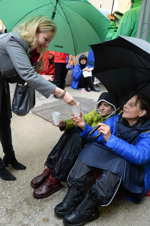 Auch am Mittwoch wurde demonstriert: Bevor der Gemeinderat im Rathaus das Verbot beschloss, haben sich außerdem Mitarbeiter der Erzdiözese Salzburg sowie Vertreter und Sympathisanten der "Plattform gegen Bettelverbot" um 8.30 Uhr zum "Stillen Protest-Betteln" vor dem Gebäude in der Getreidegasse eingefunden. Einige setzten sich auf den regennassen Boden und klopften mit leeren Bechern auf den Asphalt. "Aus dem Auge, aus dem Sinn. Bettelverbot ist keine Lösung" und "Aufruf für mehr Menschlichkeit", war auf Transparenten zu lesen. "Ein Bettelverbot auszusprechen ist beschämend. Salzburg als Menschenrechtsstadt ist verpflichtet, sich um Einzelpersonen und Gruppen zu kümmern, die besonders gefährdet sind", sagte Kurt Sonneck vom Seelsorgeamt der Erzdiözese Salzburg.