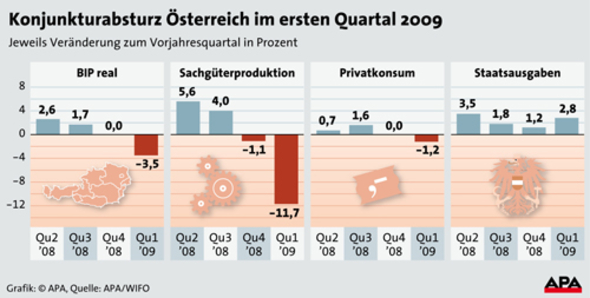 Die österreichische Wirtschaft schrumpfte im ersten Quartal 2009 stark, die Arbeitsmarktlage verschlechterte sich deutlich. Von Jänner bis April 2009 ging das Bruttoinlandsprodukt (BIP) gegenüber den letzten drei Monaten 2008 der Vorperiode real um 2,6 Prozent zurück. Im Vorjahresvergleich schrumpfte die österreichische Wirtschaft im ersten Quartal 2009 real um 3,5 Prozent.
