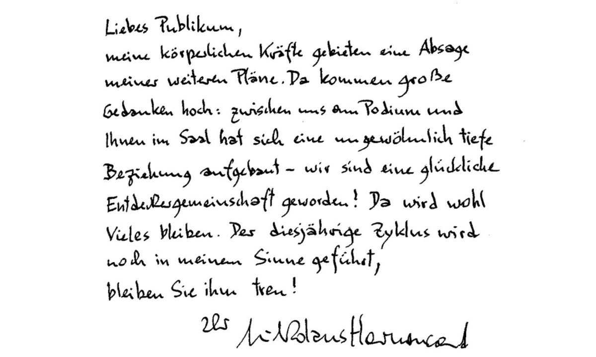 Mit einem offenen Brief an sein Publikum verabschiedet sich der Dirigent von der Konzertbühne. Seine Kräfte lassen es nicht mehr zu, sich weiterhin der Belastung von Auftritten auszusetzen.