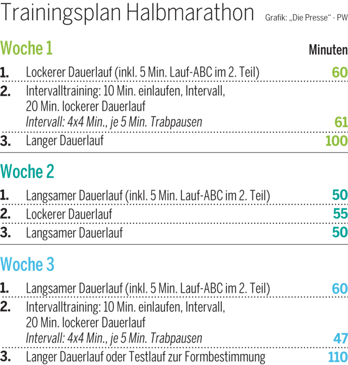Auch ich bin ungerechtfertigterweise guter Dinge. Wobei: So ungerechtfertigt finde ich meine Zuversicht ja gar nicht. Mein Neujahrsvorsatz erschöpft sich nämlich nicht in einem Null-acht-fünfzehn-Stehsatz, sondern ist ein sich auf zwei DIN-A4-Seiten erstreckender 15-wöchiger Trainingsplan – ausgearbeitet von einem Computer. Unter www.lauftipps.ch kann man, wie mir ein laufbegeisterter Kollege verraten hat, personalisierte Trainingspläne gratis ausarbeiten lassen. Eingeben musste ich dafür lediglich meinen Maximalpuls, die Länge eines Testlaufs und die dafür benötigte Zeit sowie das Datum meines geplanten Wettkampfs. In meinem Fall ist das der 10. April 2016. An dem Tag geht der Vienna City Marathon über die Bühne. Dabei werde ich mich über die halbe Distanz, die 21,0975 Kilometer, wagen. Der Computer spuckte rasch detaillierte Vorgaben für 45 Trainingseinheiten aus. Dreimal pro Woche soll ich im neuen Jahr laufen und so wöchentlich zwischen 22,9 und 40,1 Kilometer in 155 bis 256 Minuten abspulen. Es wechseln sich lockere Dauerläufe, Intervalltrainings (dabei folgen auf Belastungs- Erholungsphasen und umgekehrt) und lange Dauerläufe ab (siehe den Plan der ersten drei Wochen unten). Die Trainingsbelastung wird meist über ein paar Wochen gesteigert, dann ist eine Regenerationswoche vorgeschrieben.