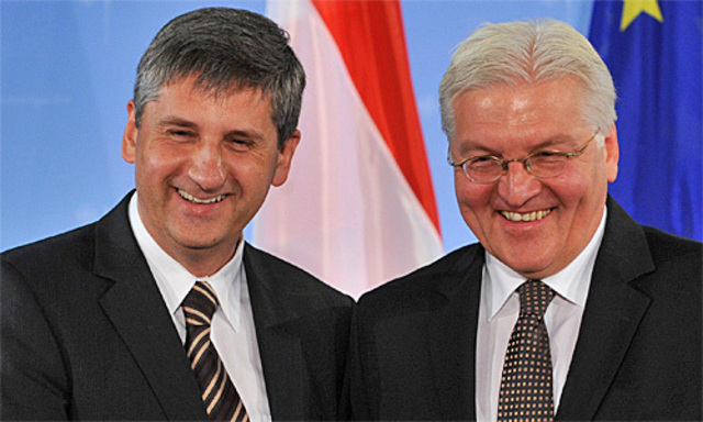 Außenminister Michael Spindelegger (VP) traf heute auf seinen deutschen Amtskollegen Frank-Walter Steinmeier (SPD) in Berlin. Sie zeigten sich besorgt über den EU-Annäherungsprozess der Balkanländer. "Die Entwicklung ist für beide Seiten sehr unbefriedigend."