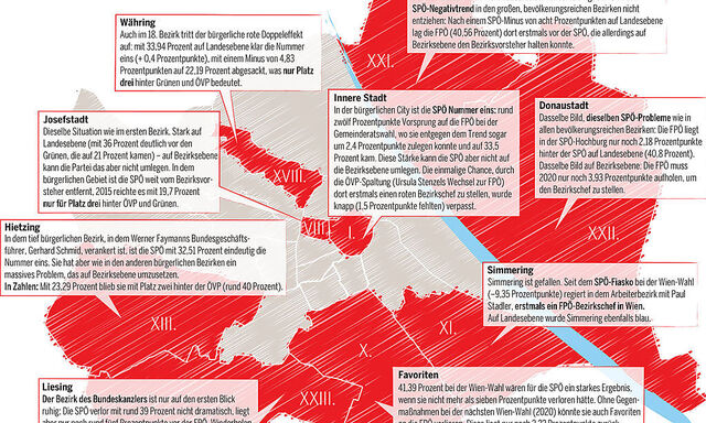 Dieser neue SPÖ-Schwerpunkt, der Fokus auf die Bezirke, führt zu einer Kernfrage: Wie ist die SPÖ in Wien, in den Bezirken überhaupt aufgestellt? Wo liegen die Problemzonen der mächtigsten roten Landespartei? Wo kann sie sich dagegen gut behaupten?