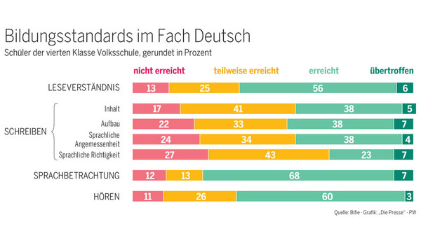 Der Test, für die im Vorjahr die Deutschkenntnisse aller Viertklässler in der Volksschule überprüft wurden, zeigen, dass knapp ein Drittel der Kinder die festgelegten Bildungsstandards nicht erreicht. Beim Rechtschreiben haben sogar 70 Prozent der Zehnjährigen Schwierigkeiten. Kinder aus Akademikerhaushalten sind ihren Mitschülern aus bildungsfernen Elternhäusern beim Lesen drei Lernjahre voraus.