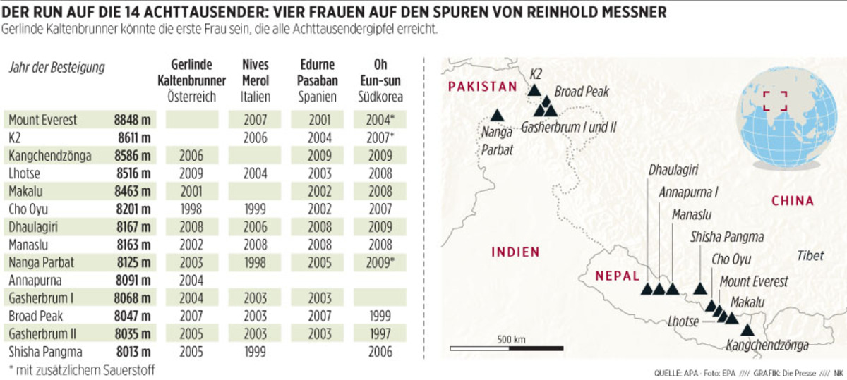 Erst nach der Jahrtausendwende standen sich plötzlich drei Frauen gegenüber, die Achttausendergipfel zu sammeln schienen wie andere Wanderabzeichen in den Hohen Tauern: Die Oberösterreicherin Gerlinde Kaltenbrunner, die Italienerin Nives Meroi und die Spanierin Edurne Pasaban.